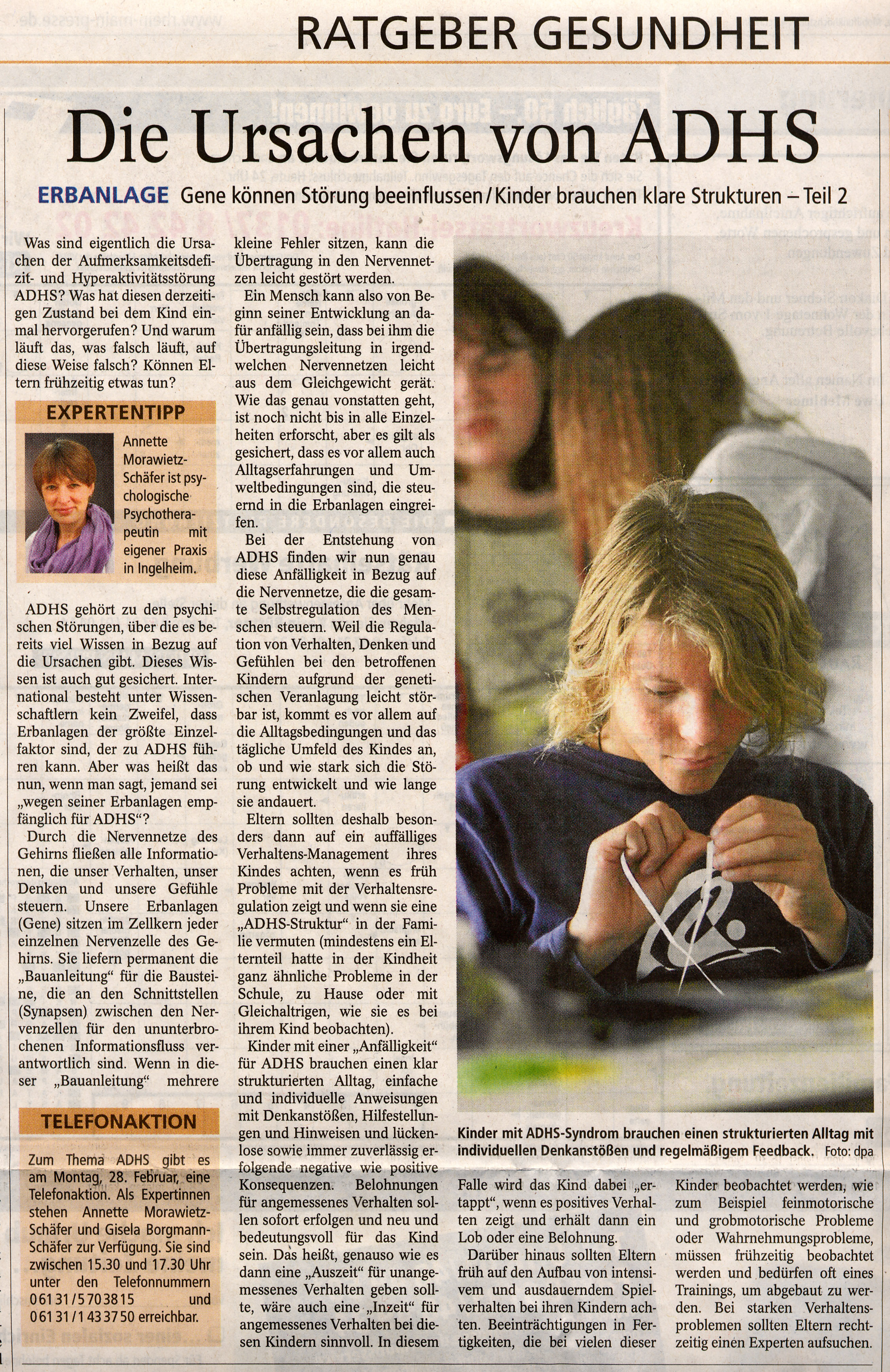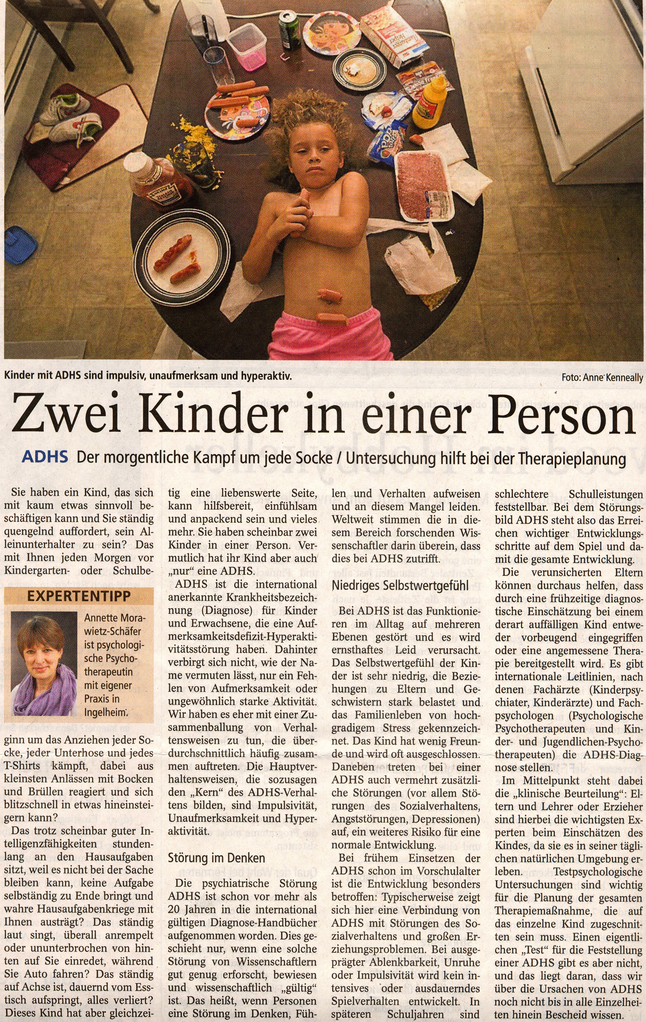 Sie haben ein Kind, das sich mit kaum etwas sinnvoll beschäftigen kann und Sie ständig quengelnd auffordert, sein Alleinunterhalter zu sein; das mit Ihnen jeden Morgen vor Kindergarten- oder Schulbeginn um das Anziehen jeder Socke, jeder Unterhose und jedes T-Shirts kämpft, dabei aus kleinsten Anlässen mit Bocken und Brüllen reagiert und sich blitzschnell in etwas hineinsteigern kann; das trotz scheinbar guter Intelligenzfähigkeiten stundenlang an den Hausaufgaben sitzt, weil es nicht bei der Sache bleiben kann, keine Aufgabe selbständig zu Ende bringt und wahre Hausaufgabenkriege mit Ihnen austrägt; das ständig laut singt, überall anrempelt oder ununterbrochen von hinten auf Sie einredet, während Sie Auto fahren; das ständig auf Achse ist, dauernd vom Esstisch aufspringt, alles verliert, ... ?
